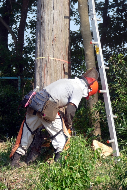 写真のように、作業員が安全帯とロープを使用し、木に登って作業